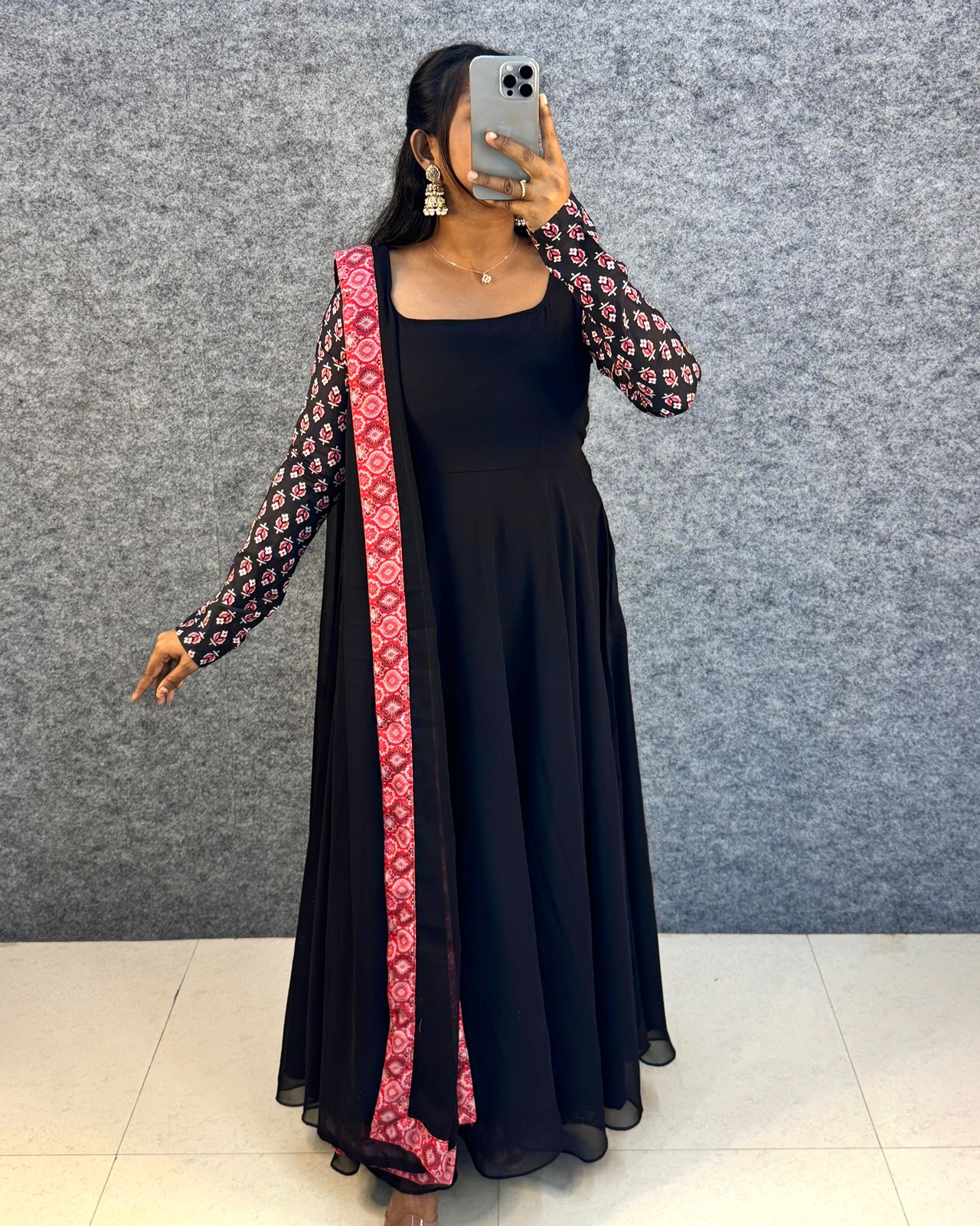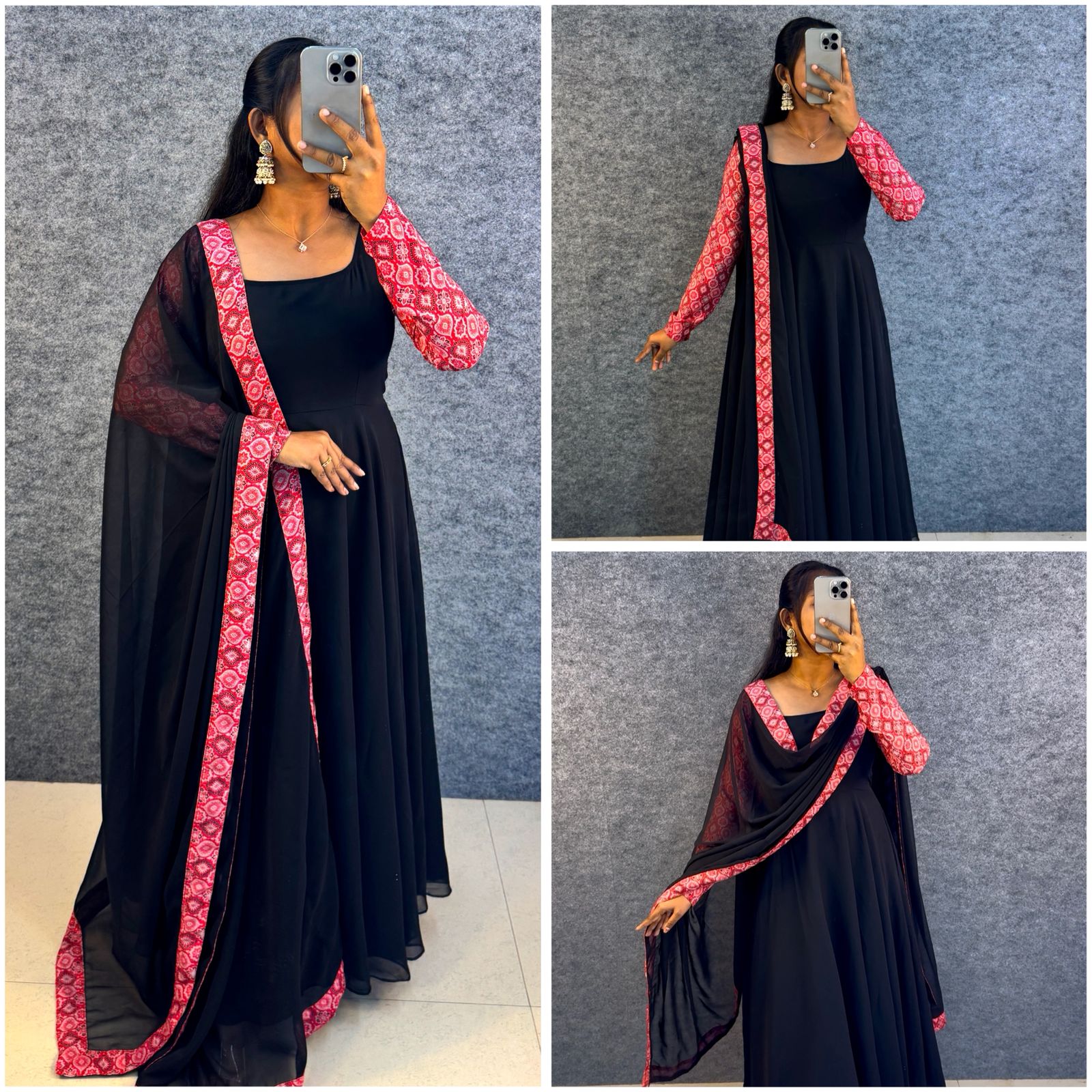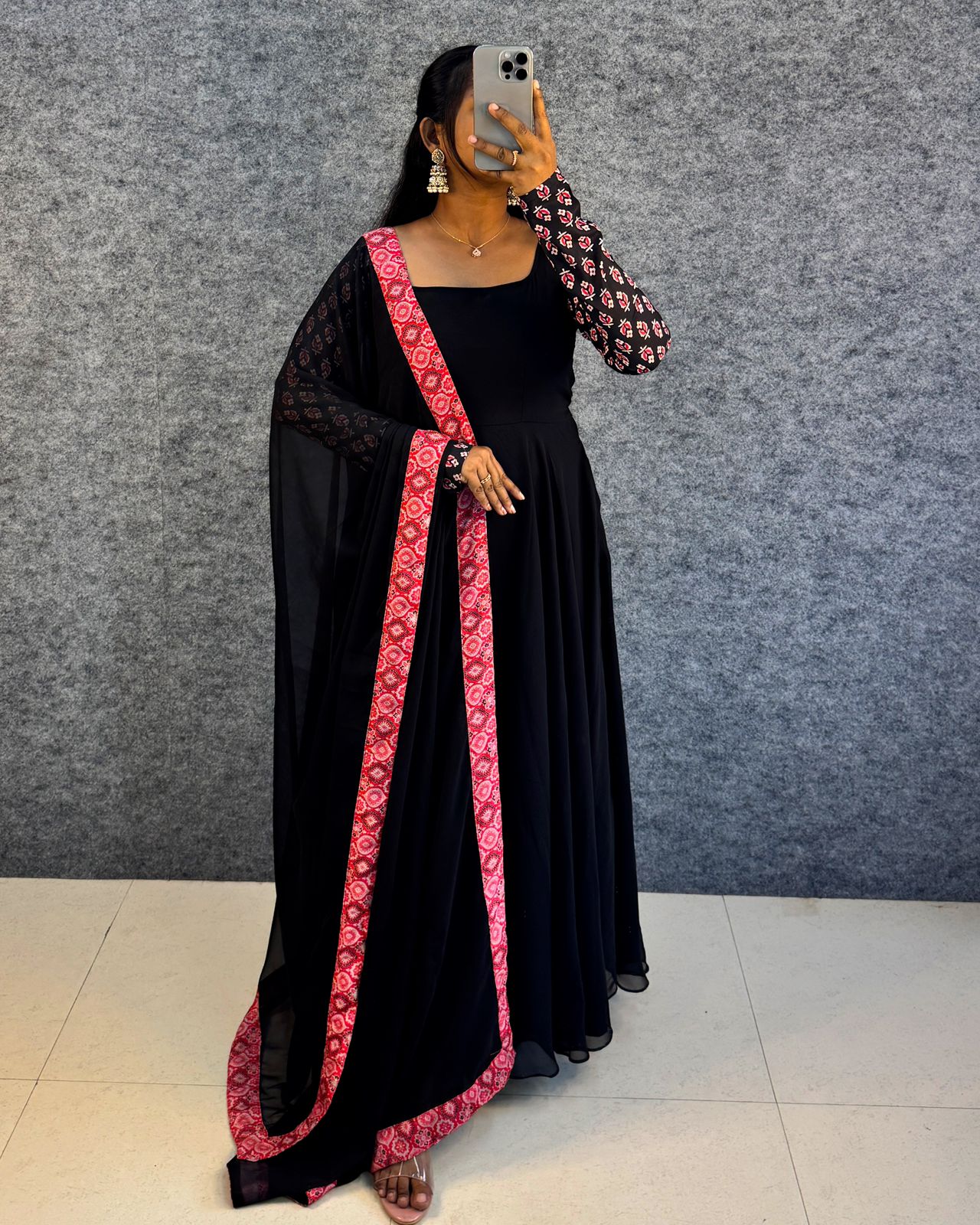 we have recreated this exact Anarkali outfit made with premium faux Georgette fabric with premium cotton ajrakh print sleeves and beautiful four side lace georgette dupatta.This anarkali dress give fashion festive vibe for upcoming festivals..