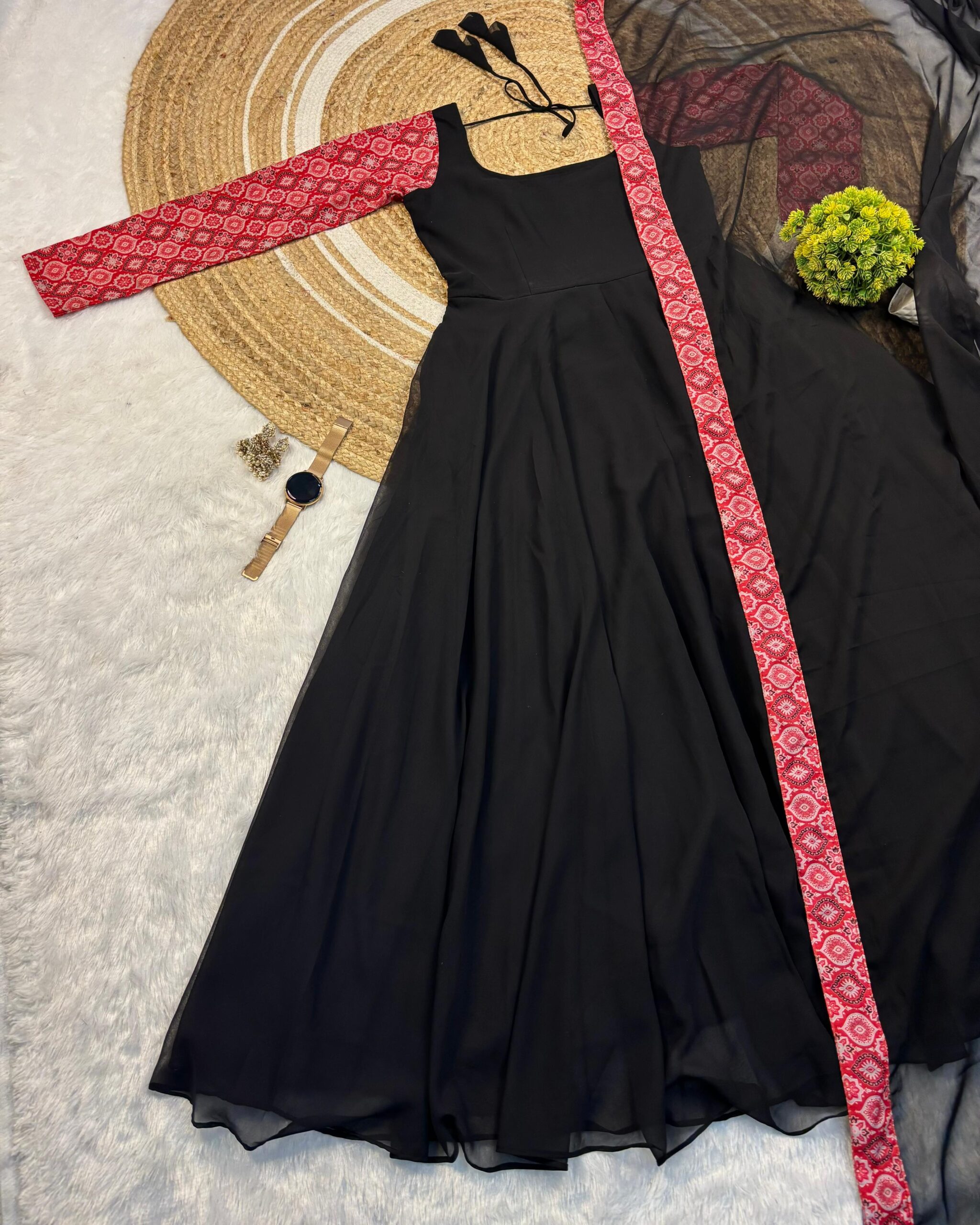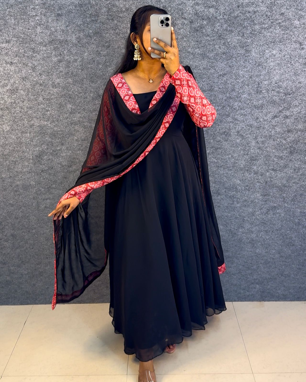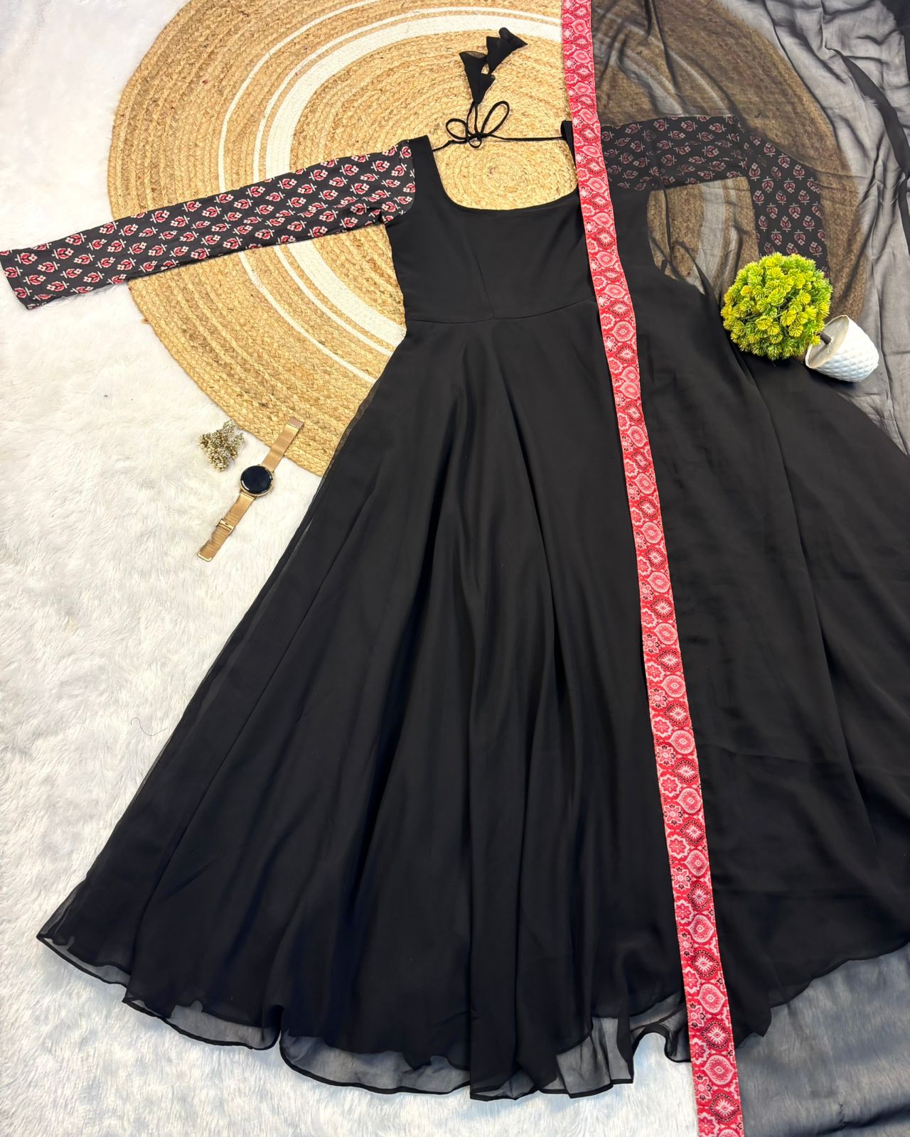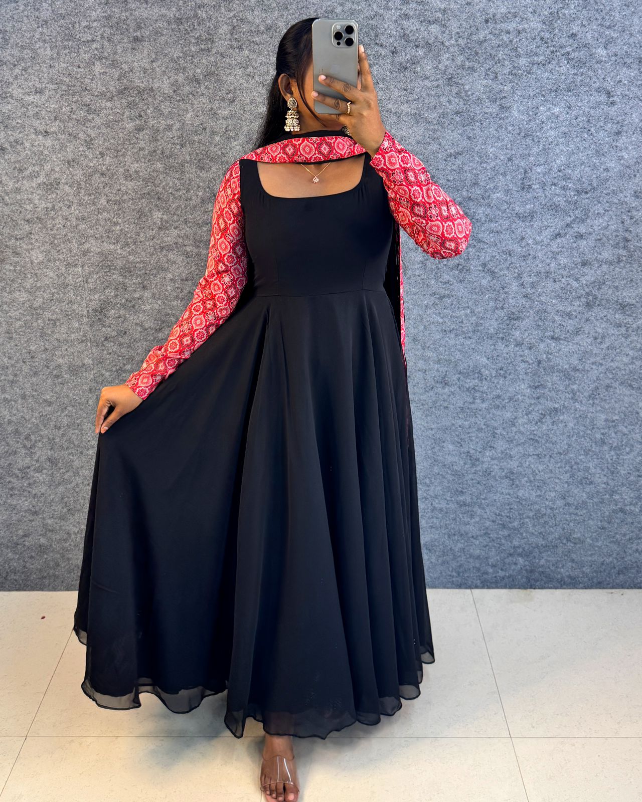we have recreated this exact Anarkali outfit made with premium faux Georgette fabric with premium cotton ajrakh print sleeves and beautiful four side lace georgette dupatta.This anarkali dress give fashion festive vibe for upcoming festivals..