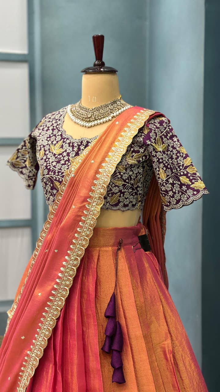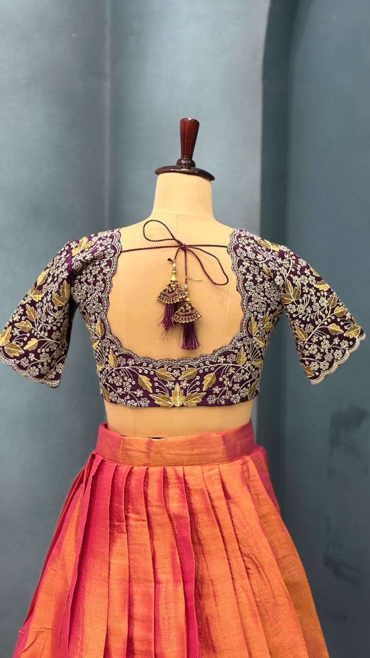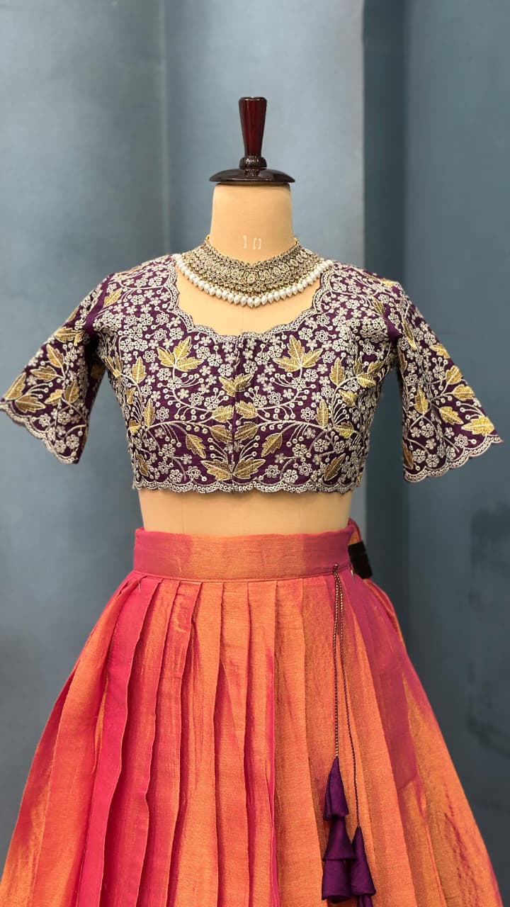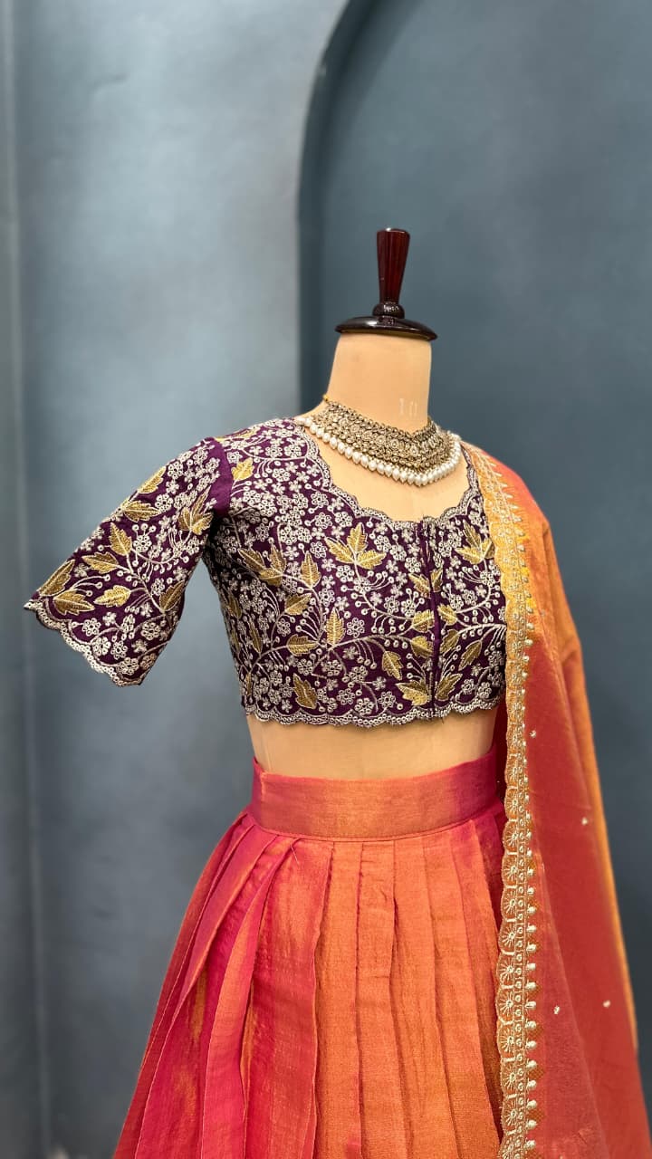 *This ensemble is a fusion of vibrant South Indian textile tradition with embroidery finesse. The contrast of the orange-pink lehenga with the wine embroidered blouse creates a striking visual balance. The outfit is festive, regal, and perfect for occasions like weddings, sangeet, festive pujas, or receptions.