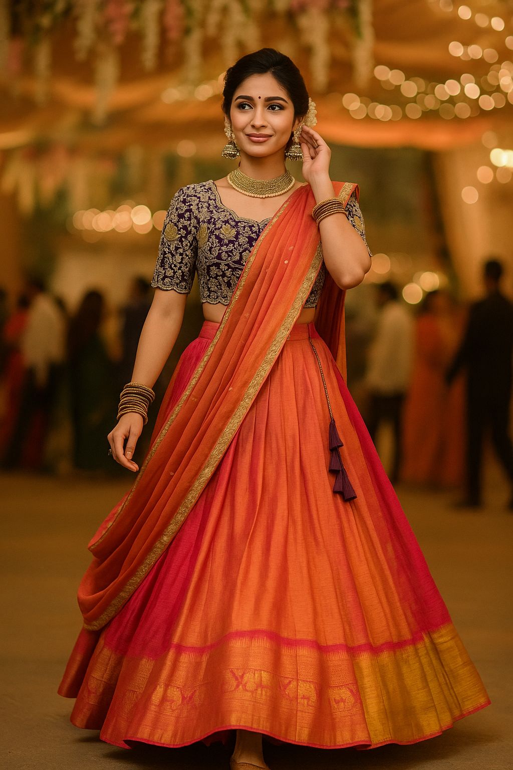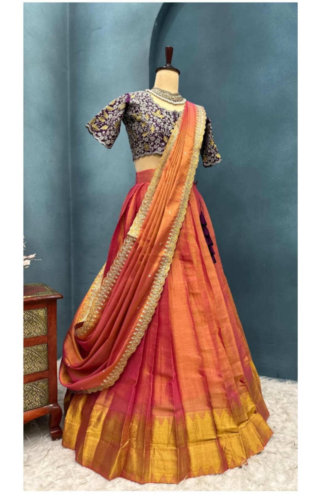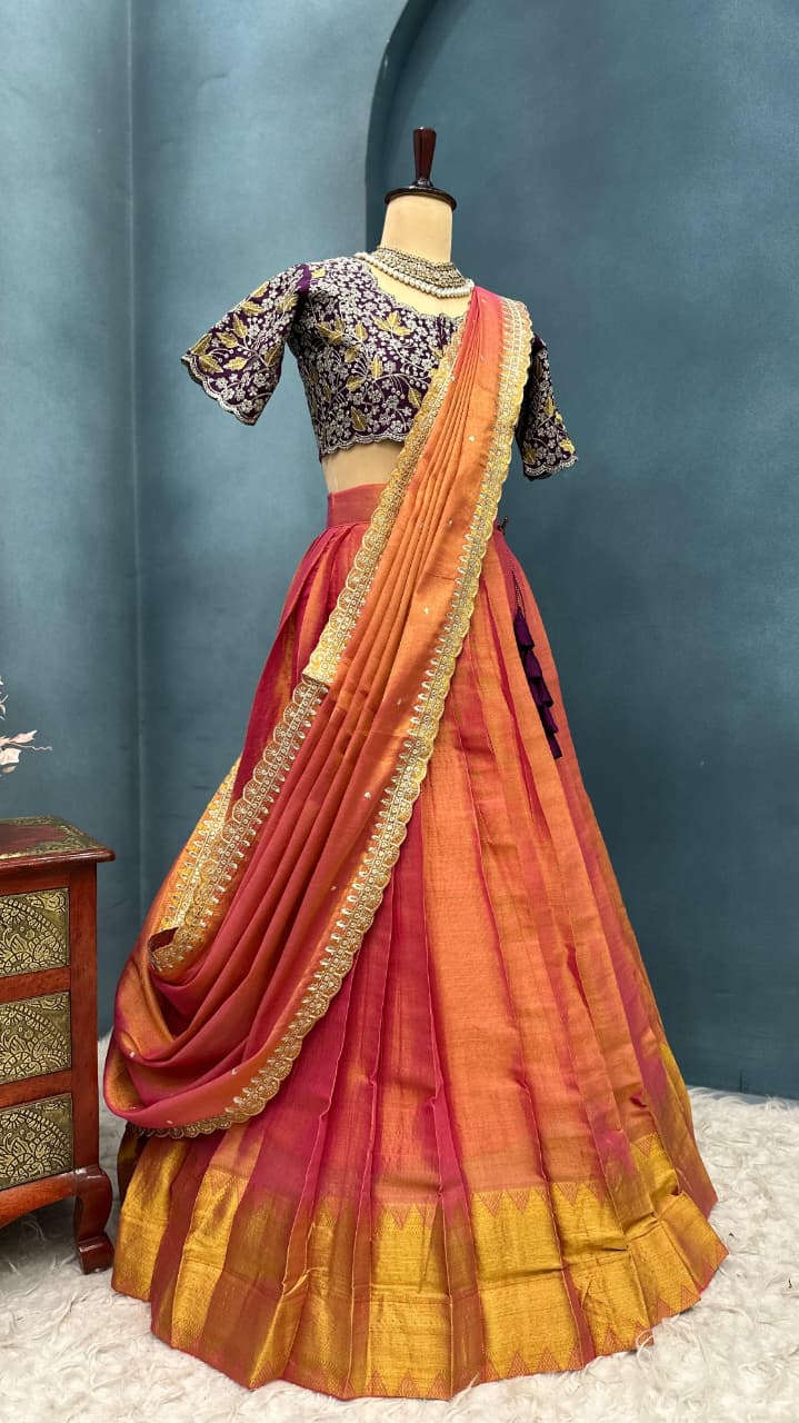 *This ensemble is a fusion of vibrant South Indian textile tradition with embroidery finesse. The contrast of the orange-pink lehenga with the wine embroidered blouse creates a striking visual balance. The outfit is festive, regal, and perfect for occasions like weddings, sangeet, festive pujas, or receptions.