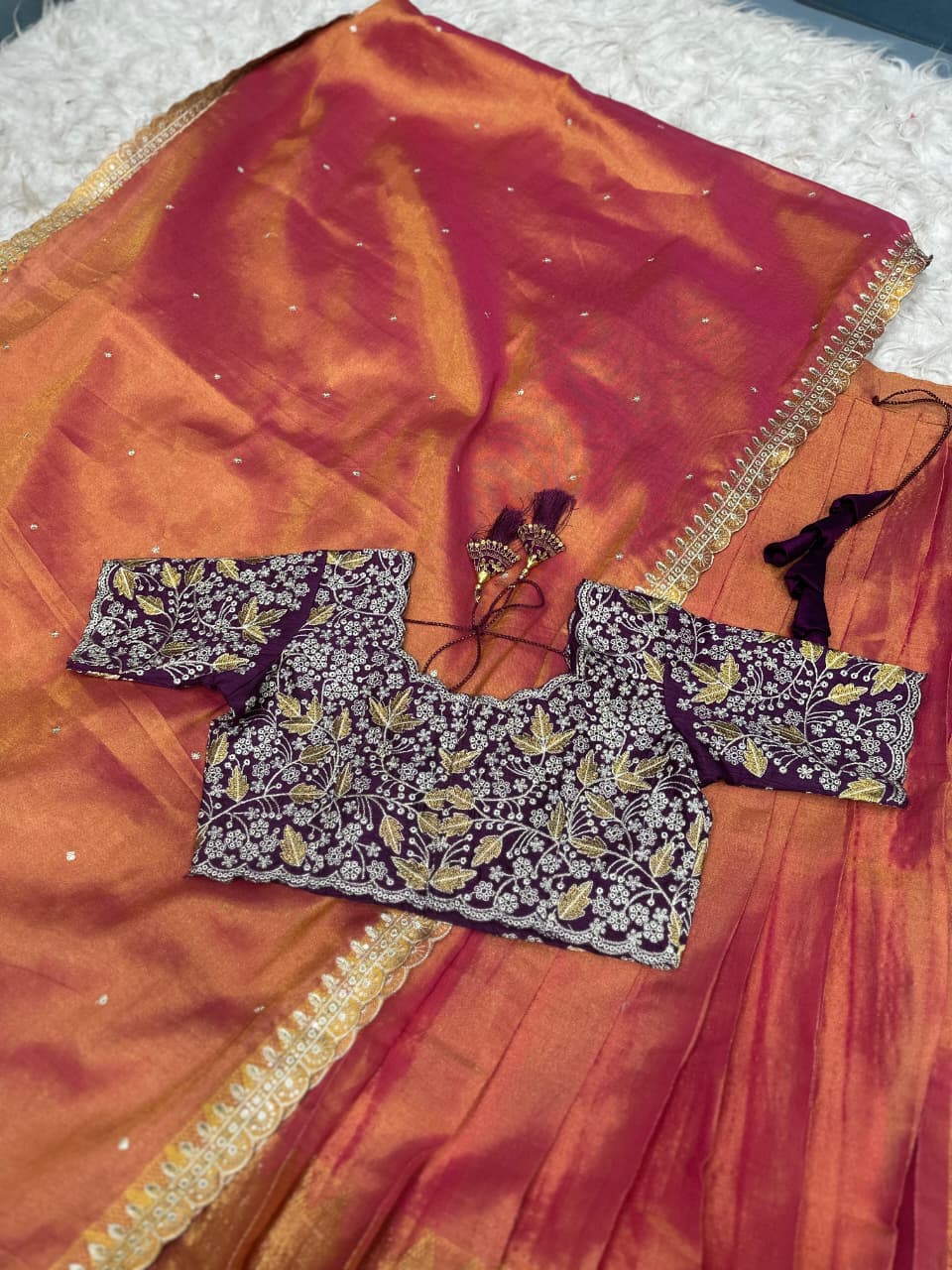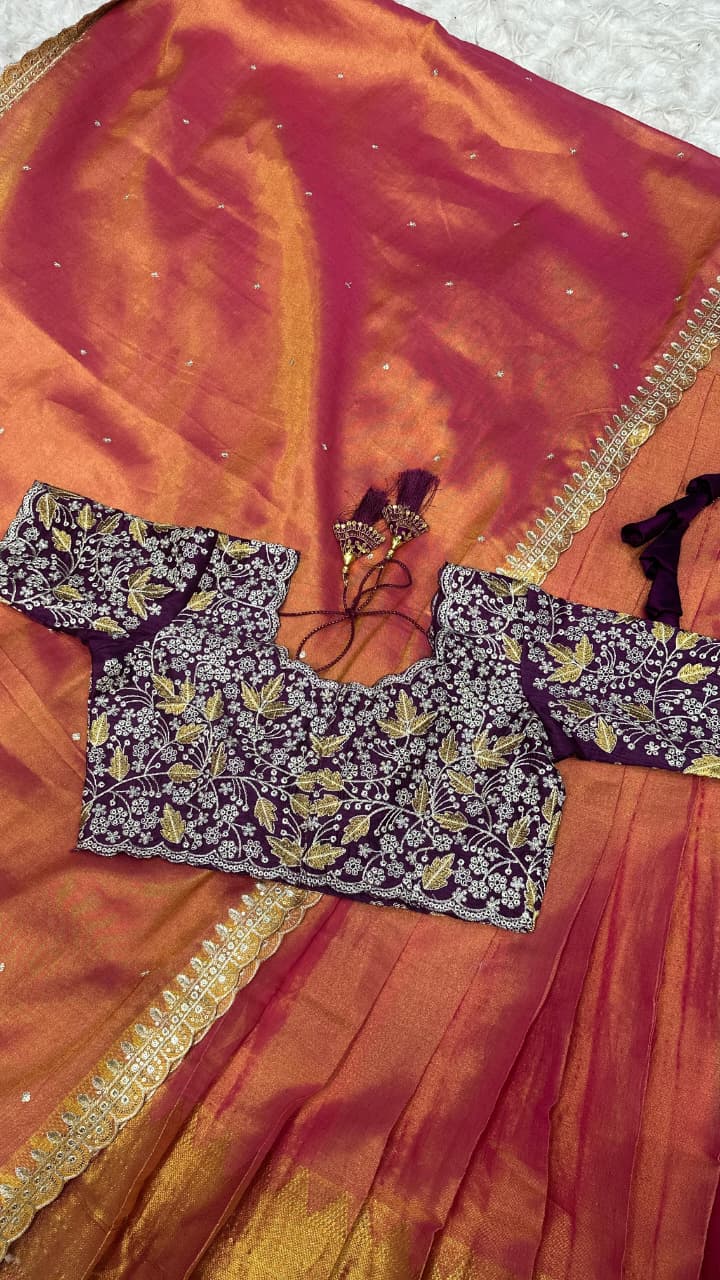 Fabric details:-Full stiched Dual-toned Tissues silk orange and deep pink ombré effect, flowing beautifully with pleats. -blend with a natural sheen