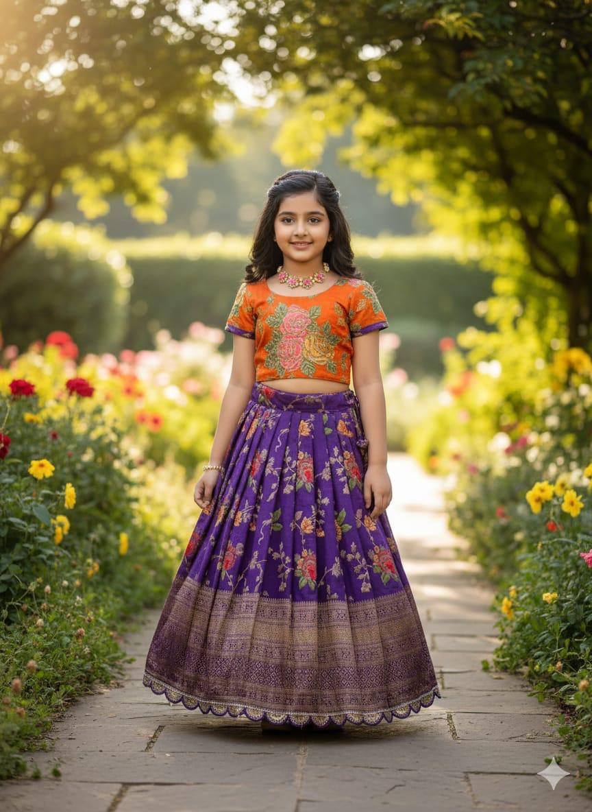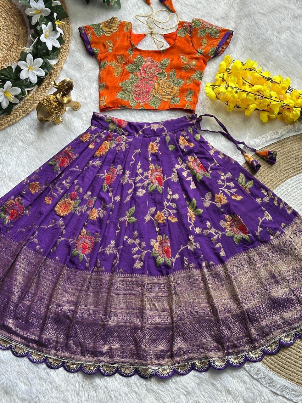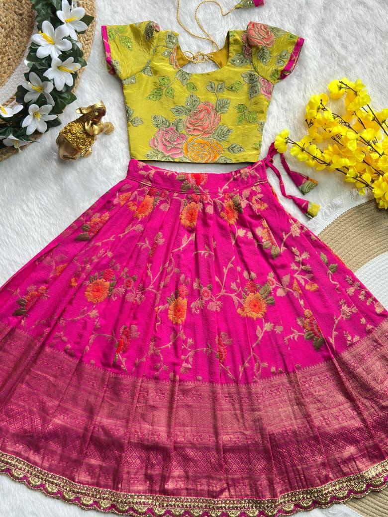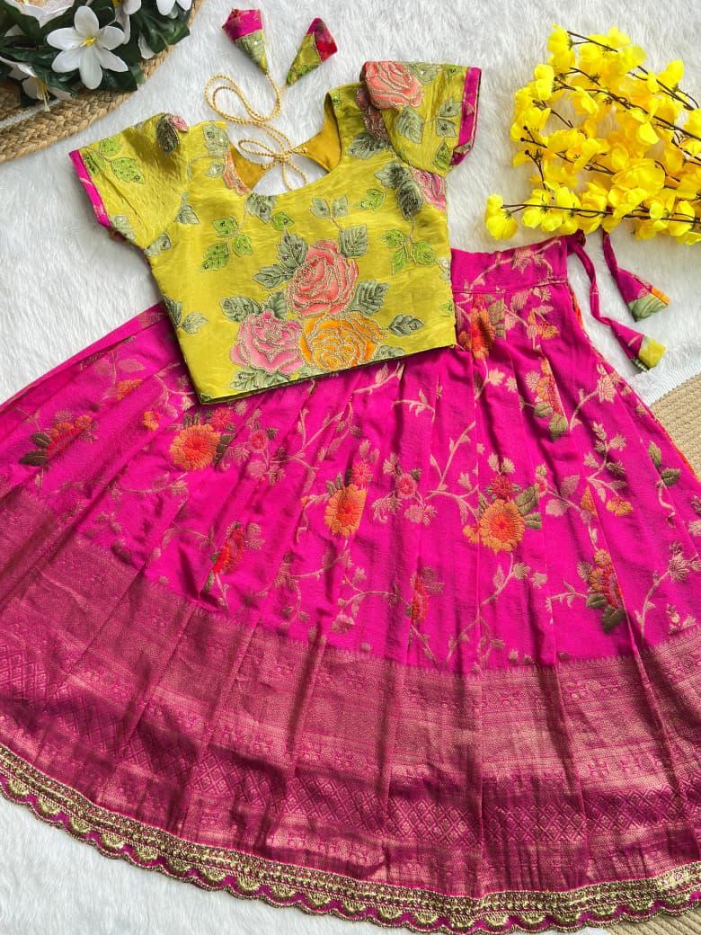 Beautiful Flower Position Work blouse paired with Golden zari Pure Tissue skirt, perfect for kids. Available in various sizes, from 6 months to 16 years, for a stunning look.