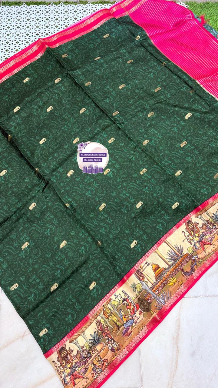 Pure chinon crepe Saree in rich deep green shade with elegant weaving motifs all over.