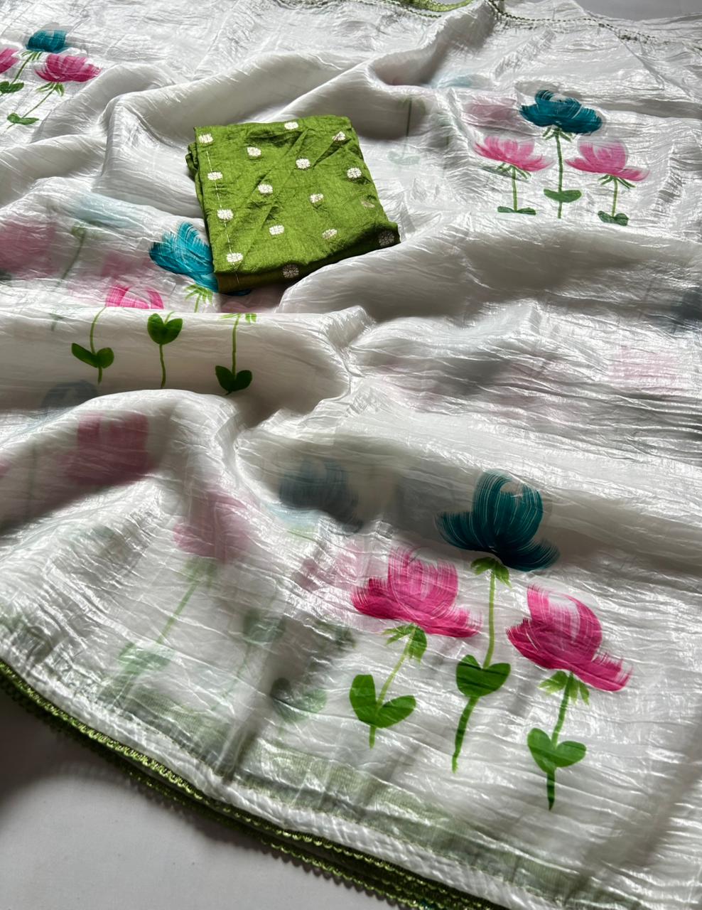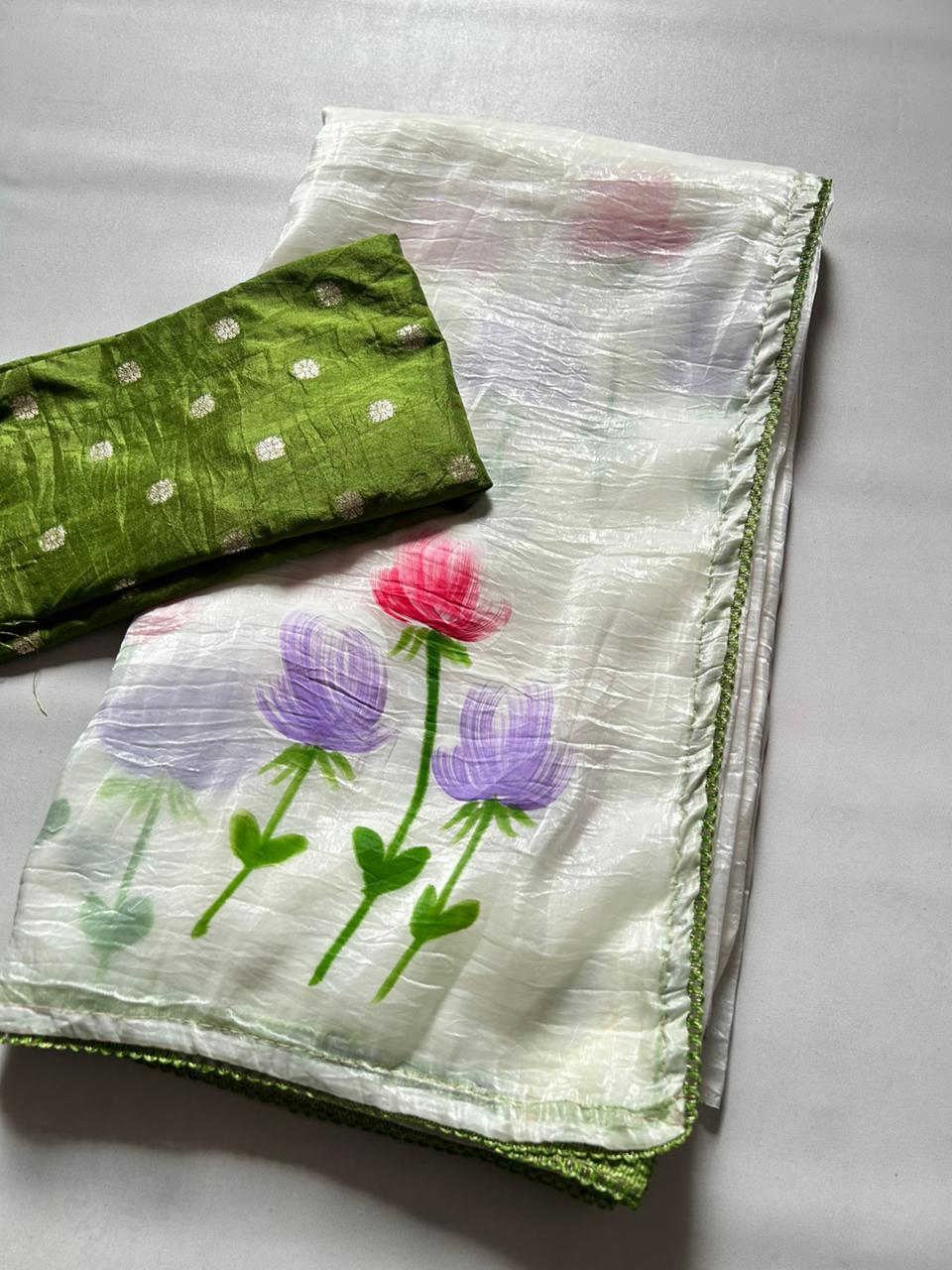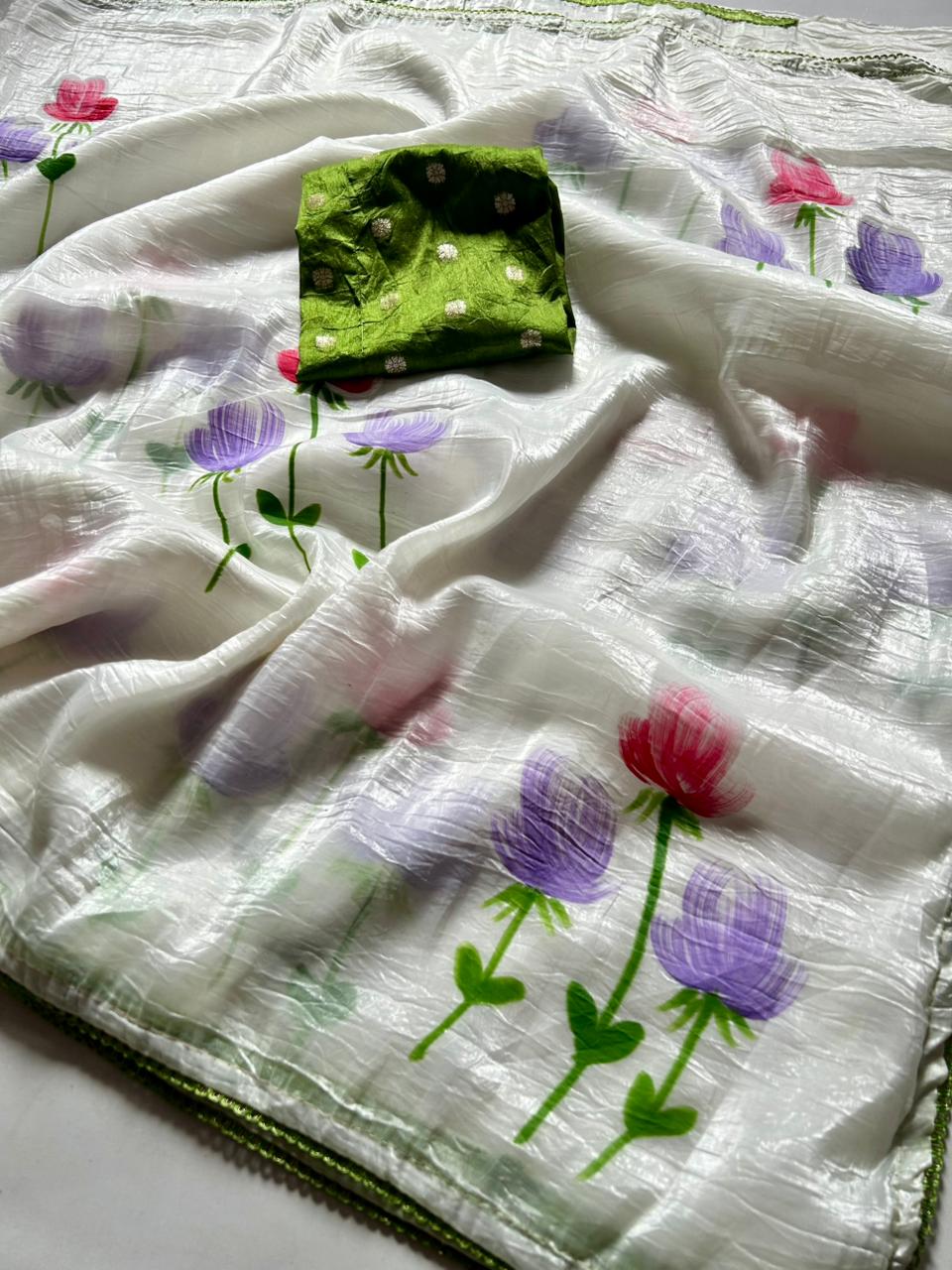 Description – Pure crush silk saree with all over brush, print beautiful flower design and one more beautiful less border design.