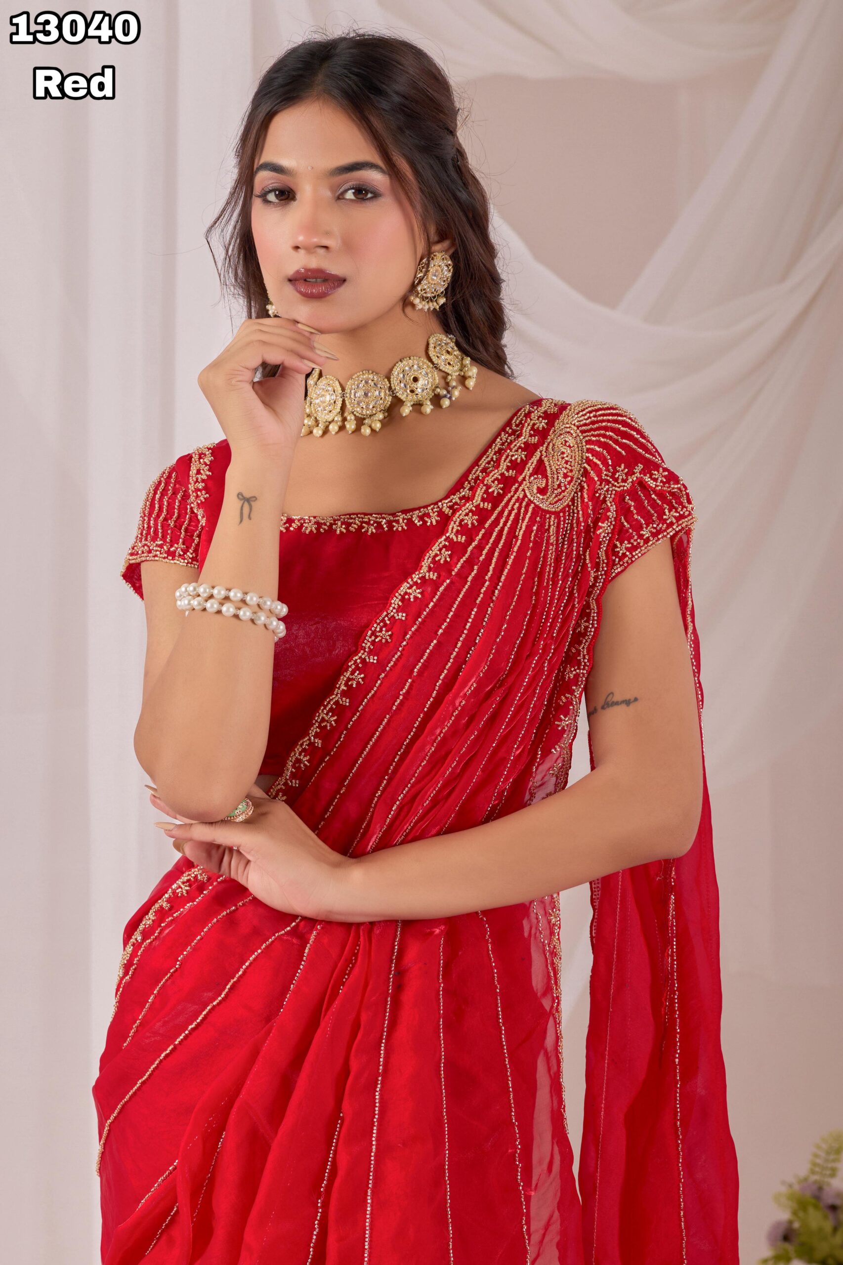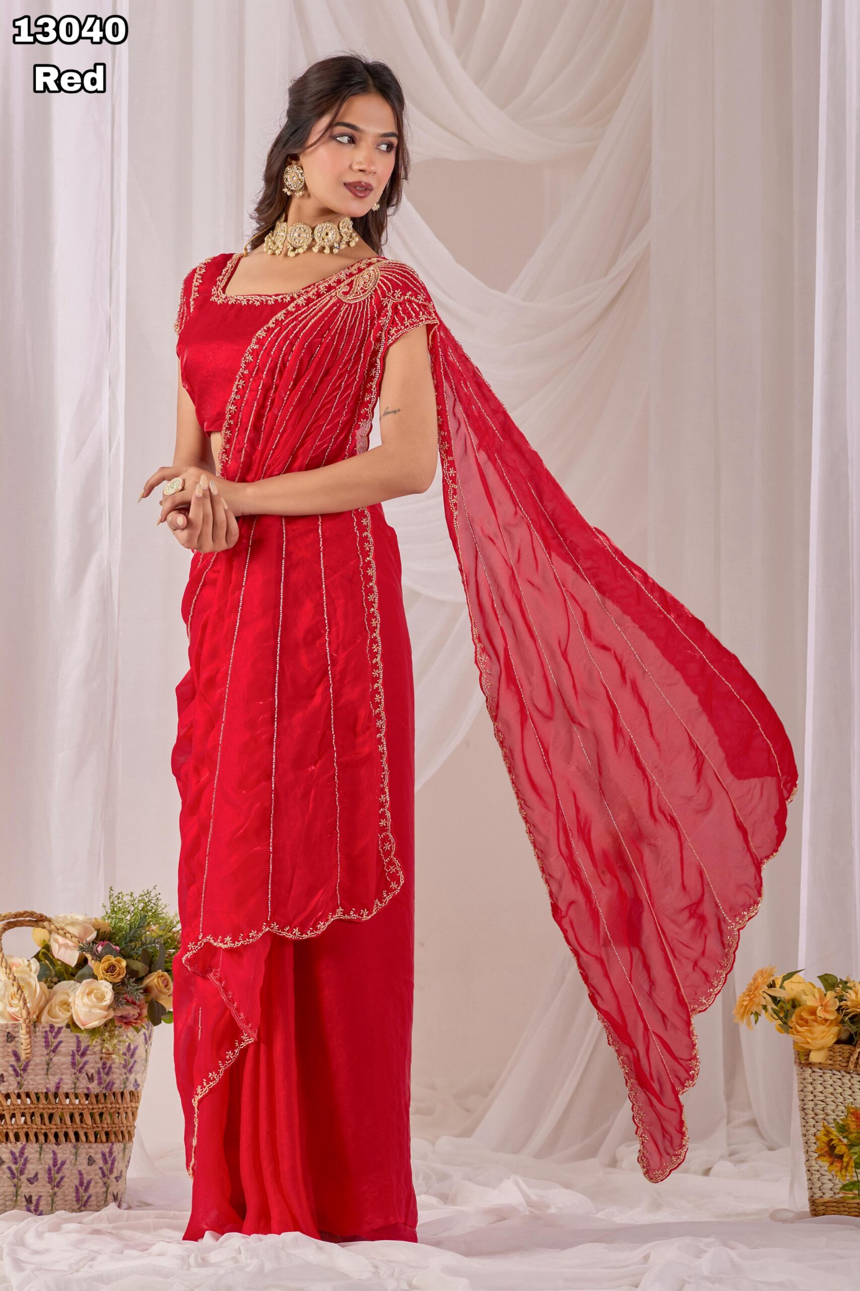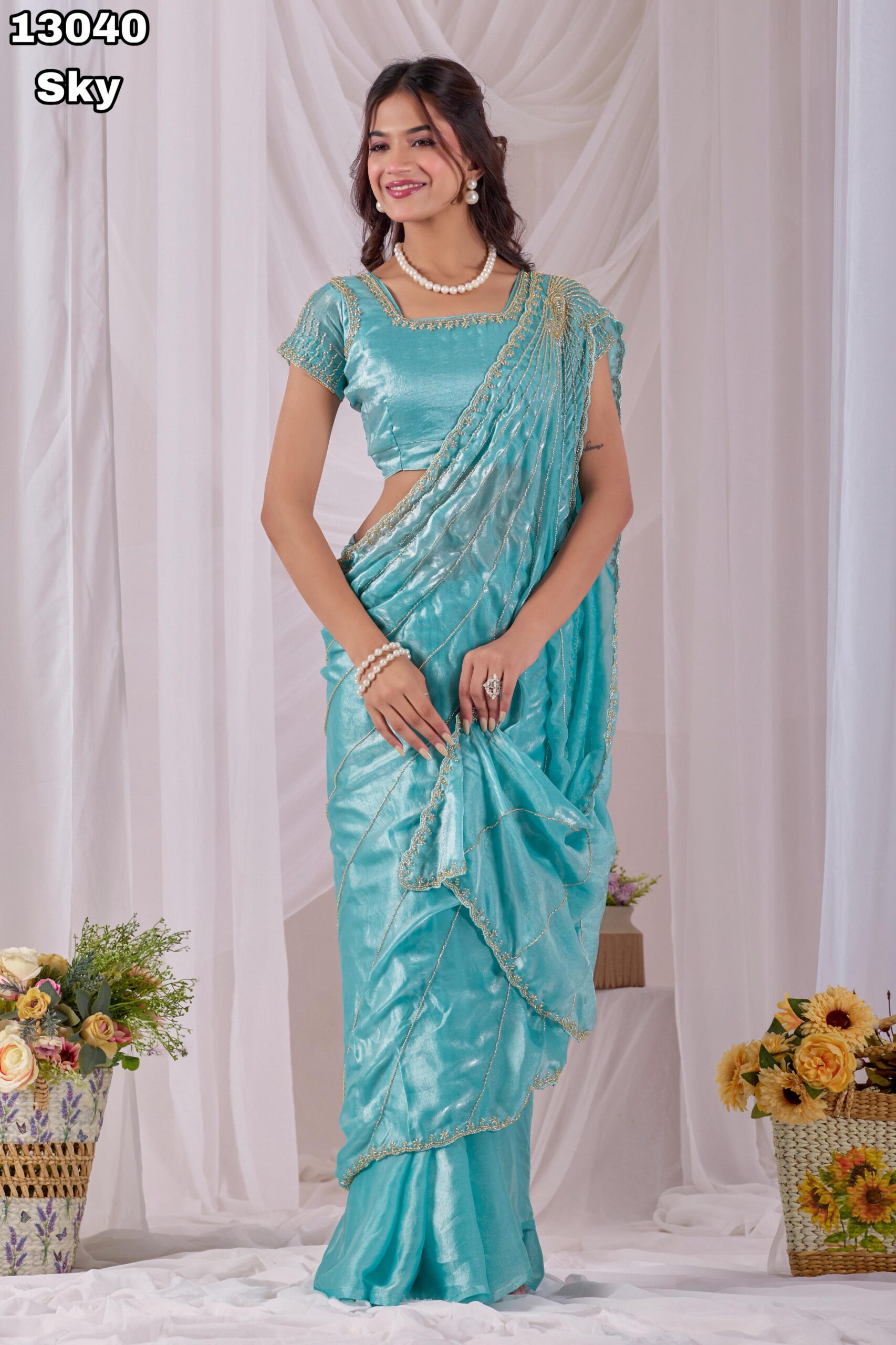 Fabric – Soft Space silk fendy satin with cutdana handwork maggam work saree with fancy pallu & scalloped cutwork border