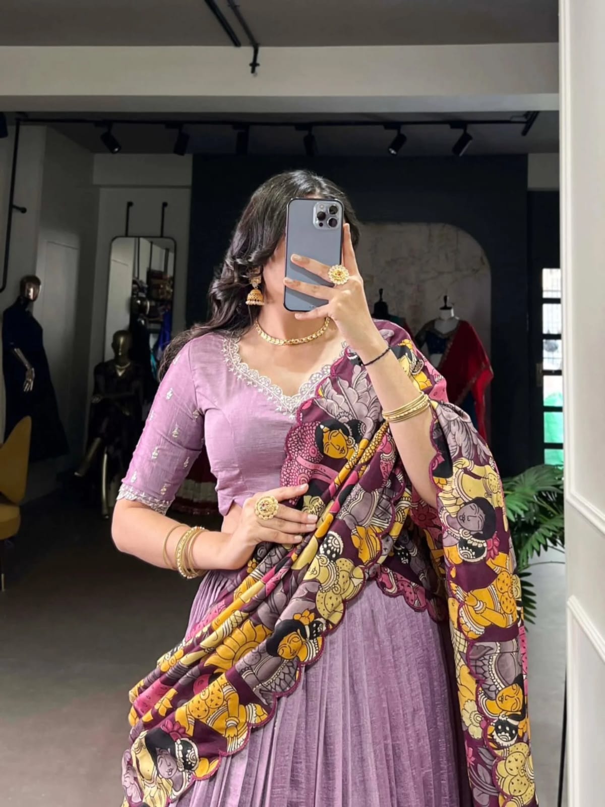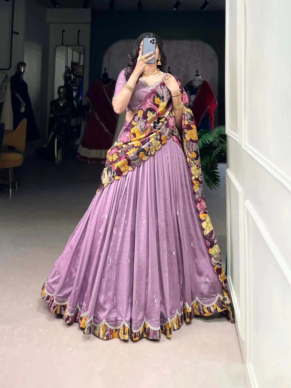 Lehenga Work : Sequins and Thread Embroidery Work With Kalamkari Print Border